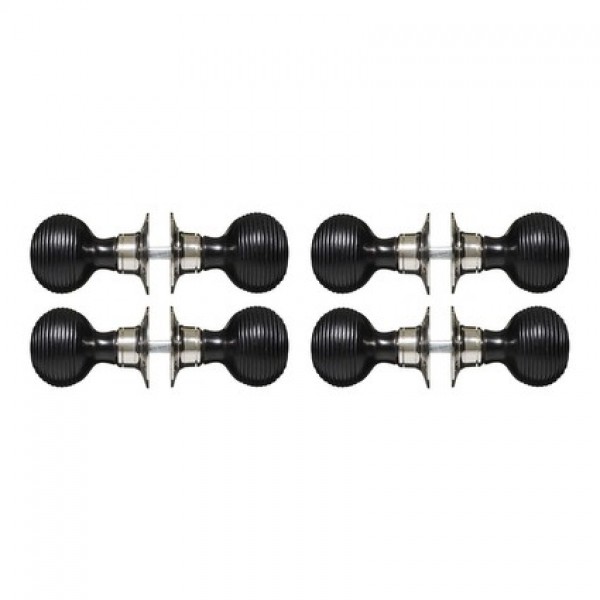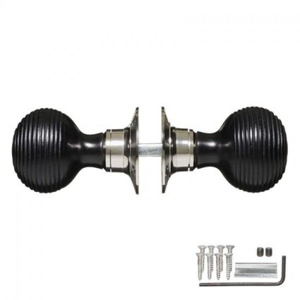 High quality, hand turned, black wooden door knobs/handles and nickel Rose plates.