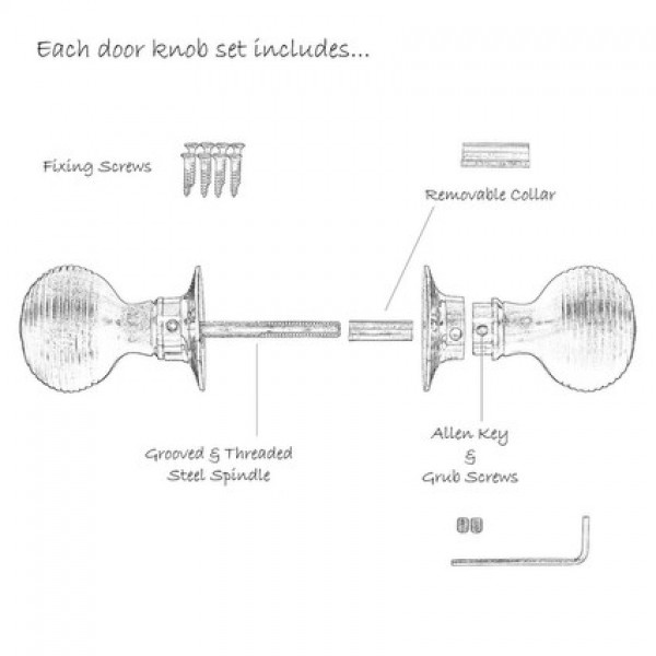 • Each set comes individually wrapped in its own box with door knobs, steel spindle, all fixing screws, hex head steel grub screw & individual Allen key for fitting grub screws.
